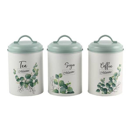 - MR-1773-3CS Zestaw pojemników metalowych 3 szt. • zestaw pojemników 3 szt. • materiał: stal węglowa • pojemnik na kawę / herbatę / cukier • wysokość: 18,5 cm • średnica: 11,3 cm • pojemność: 1,4 l
