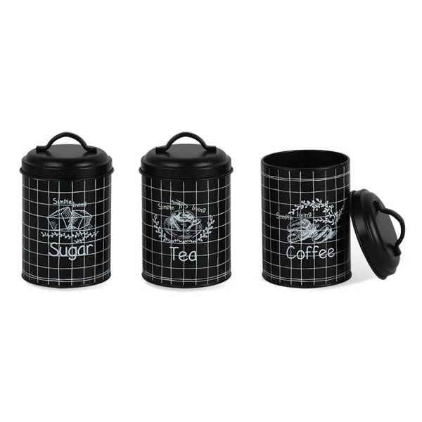 - MR-1774-3CS Zestaw pojemników metalowych 3 szt. • zestaw pojemników 3 szt. • materiał: stal węglowa • pojemnik na kawę / herbatę / cukier • wysokość: 18,5 cm • średnica: 11,3 cm • pojemność: 1,4 l