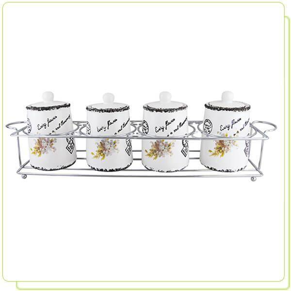 - MR-20049-04CS Zestaw pojemników 5 elementów "NIEZAPOMINAJKA" • komplet 4 pojemników do przypraw • materiał: ceramika • aluminiowy stojak