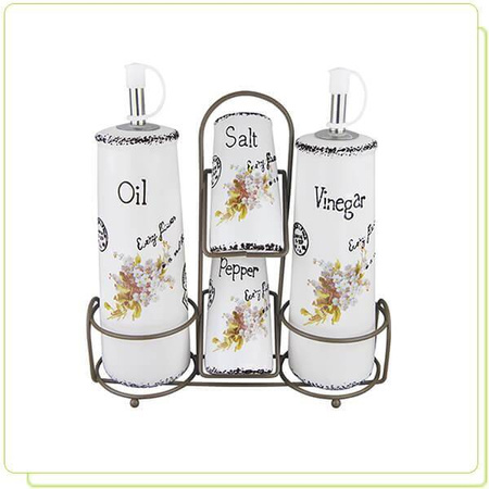 - MR-20049-04S Zestaw do przypraw 5 elementów "NIEZAPOMINAJKA" • butelka do octu • butelka do oleju • solniczka • pieprzniczka • aluminiowy stojak • materiał: ceramika