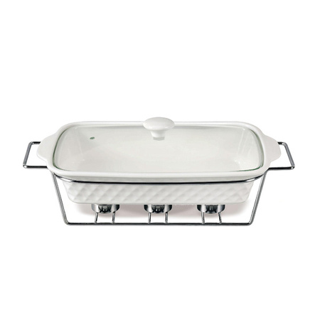 - MR-11259-73 Podgrzewacz do potraw prostokątny biały 30 cm, 1,1 l • pojemność: 1,1 l • materiał: ceramika • szklana pokrywka • rozmiary zewnętrzny naczynia: 30 x 17 сm • rozmiar wewnętrzny naczynia: 23,5 x 13,5 cm • stelaż na świeczki typu tealight – 2 szt