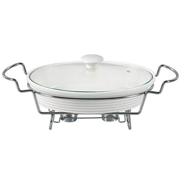 - MR-11260-74 Podgrzewacz do potraw owalny biały 30 cm, 1,6 l • pojemność: 1,6 l • materiał: ceramika • szklana pokrywka • rozmiary zewnętrzny naczynia: 30 x 21 сm • rozmiar wewnętrzny naczynia: 27 x 18 cm • stelaż na świeczki typu tealight – 2 szt.