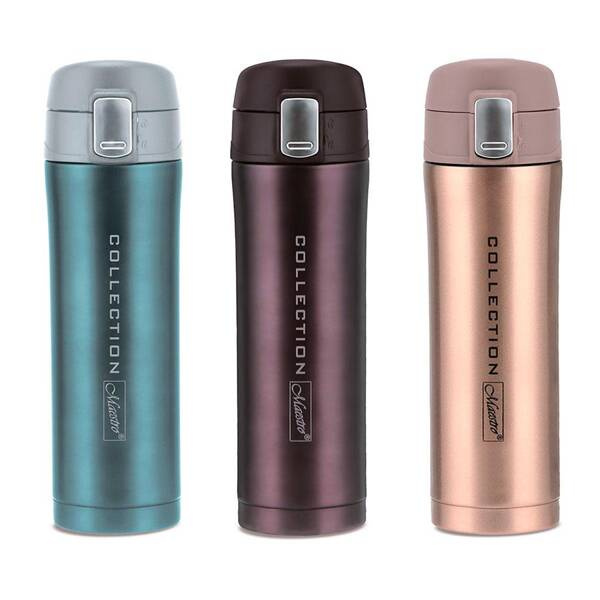 - MR-1641-45-BLUE Kubek termiczny 450 ml • pojemność: 450 ml • wymiary: 23,5 x 6,5 cm • waga produktu: 330 g • wygodny „dziubek” do picia, nie trzeba odkręcać • blokada otwierania zapobiega wylaniu napoju • materiał: stal nierdzewna 304 + tworzywo sztuczne