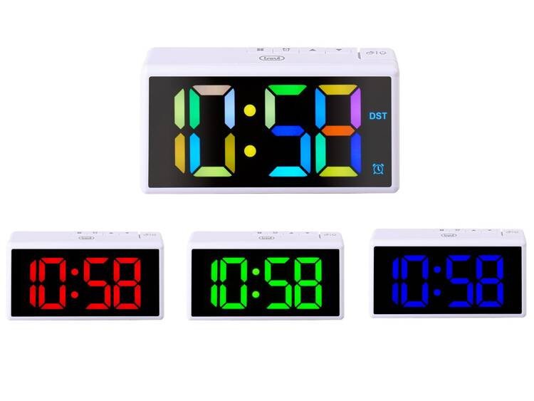 - Wielokolorowy cyfrowy wyświetlacz LED Lustrzane wykończenie przodu Zegar 12/24h Elektroniczny dzwonek z 3-stopniową głośnością Regulacja wyświetlacza Chwilowe przerwanie alarmu drzemki Gniazdo USB do ładowania urządzeń zewnętrznych Podwójne zasilanie: 3 b
