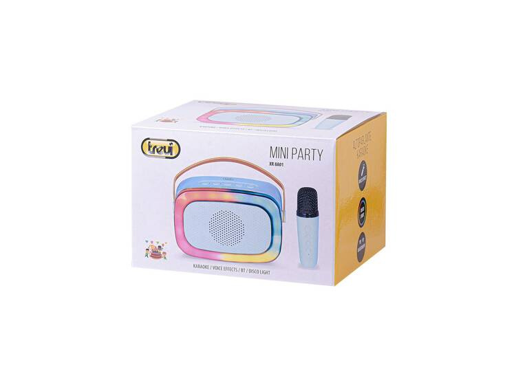 Głośnik ze wzmocnieniem Bluetooth i mikrofonem bezprzewodowym Umożliwia bezprzewodowe słuchanie muzyki ze wszystkich urządzeń Bluetooth® (smartfonów, tabletów, komputerów PC) Śpiewaj za pomocą mini mikrofonu bezprzewodowego i wielu efektów głosowych Wielokolorowa podświetlana ramka Disco Light Odtwarzacz plików MP3 z USB i karty Micro SD (brak w zestawie) Wejście AUX-IN Regulacja głośności i oświetlenie dyskotekowe Całkowita moc 10W Zasilanie urządzenia i mikrofonu: Bateria litowa ładowana przez port typu C Wymiary jednostki: 13,5 (dł.) x 9 (gł.) x 7 (wys.) cm Rozmiar mikrofonu: 13,5 (szer.) x 3,5 (wys.) cm Waga: 450g Gwarancja producenta