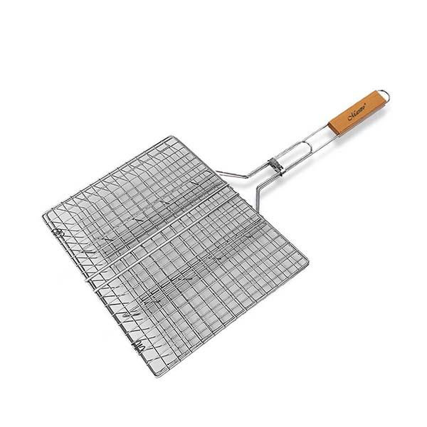 - MR-1016 Siatka grillowa potrójna 24 x 30 cm • kratka grillowa / metalowy ruszt do grilla • 3 sekcje do grillowania żywności • materiał: stal chromowana • rozmiar: 24 x 30 cm • zamykana konstrukcja • nienagrzewająca się drewniana rączka