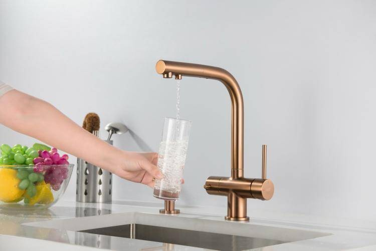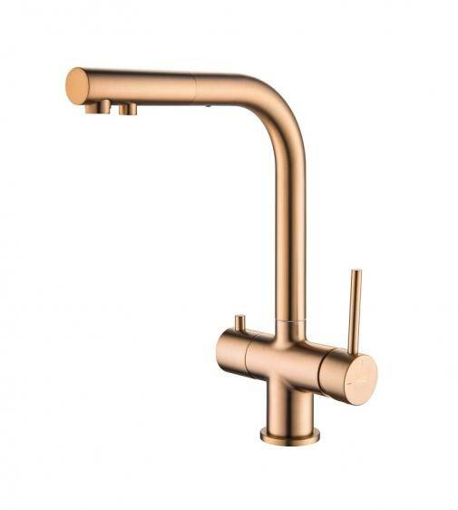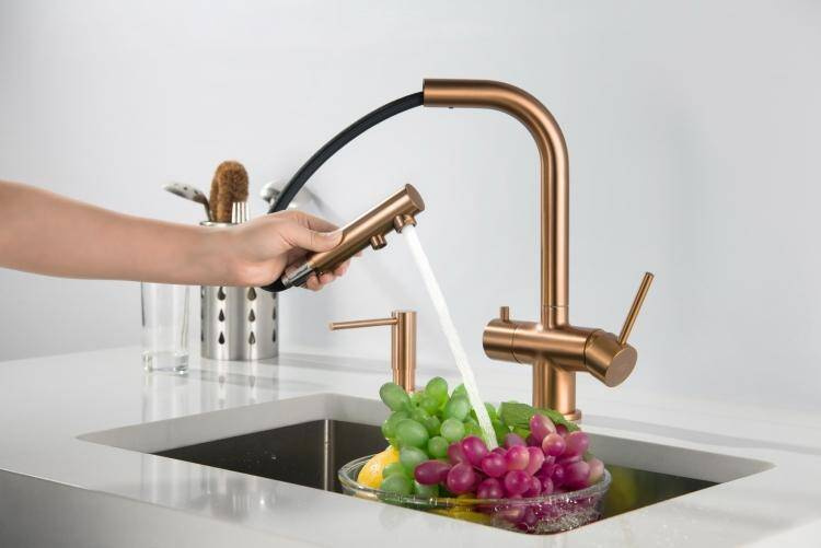 - Bateria dwuobwodowa miedziana z wyciąganą wylewką i podłączeniem filtrów do wody, bateria trójdrożna z wyciąganą wylewką