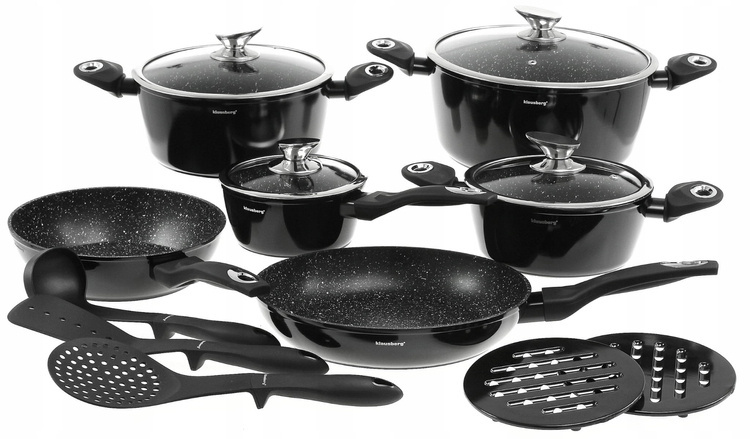 - Nowoczesny komplet granitowych garnków w połysku. Zestaw składa się z 15 elementów, 3 garnków, 2 patelni, rondla, 2 podstawek pod naczynia i 3 przyborów kuchennych, przydatnych podczas gotowania i smażenia. Naczynia posiadają indukcyjne dna. Szklane pokry