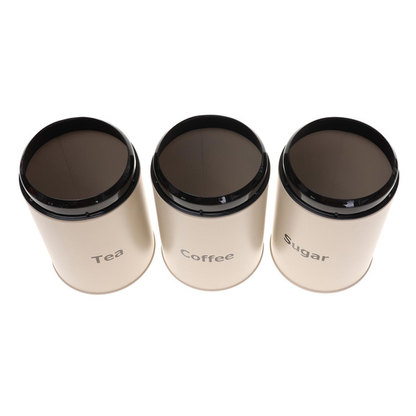 - Na pojemnikach czarny napisy Sugar, Coffee, Tea.