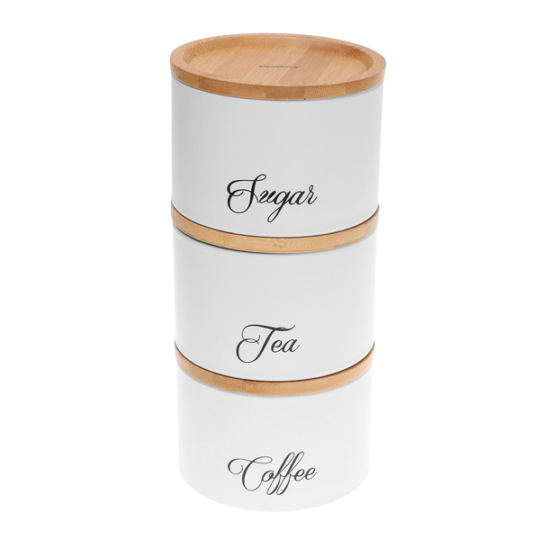 - Na pojemnikach czarny napisy Sugar, Coffee, Tea.