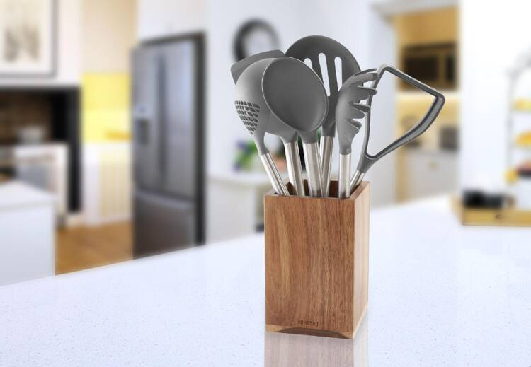 1 x łyżka cedzakowa 1 x łyżka klasyczna 1 x łyżka do makaronu 1 x szpatuła z otworami 1 x łyżka wazowa 1 x ubijak do ziemniaków 1 x stojak z dr