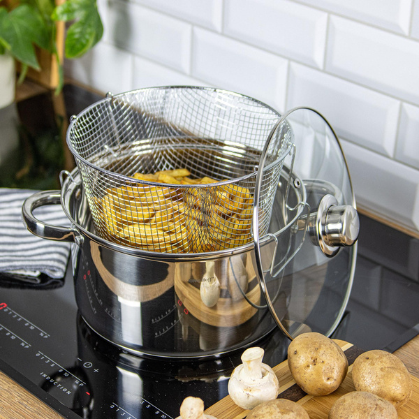 - Nowoczesny garnek ze szklaną pokrywą z wielowarstwowym dnem dzięki któremu żywność szybko się nagrzewa i długo podtrzymuje ciepło. Wyjmowany kosz umożliwia smażenie potraw w głębokim tłuszczu lub gotowanie warzyw, pierogów lub makaronu z możliwością szybk