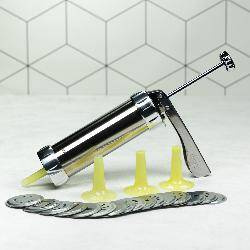Maszynka do ciastek posiada 4 wzorów ciastek oraz możliwość regulowania ich grubości. Dzięki odpowiednio zaprojektowanemu tłokowi ciasto jest w całości przesuwane w cylindrze wyciskarki do ciastek co niweluje problem zapychania się dyszy. W zestawie otrzymasz także 4 dysze i 20 tarcz, które służą do dekorowania ciastek, ciast i tortów.