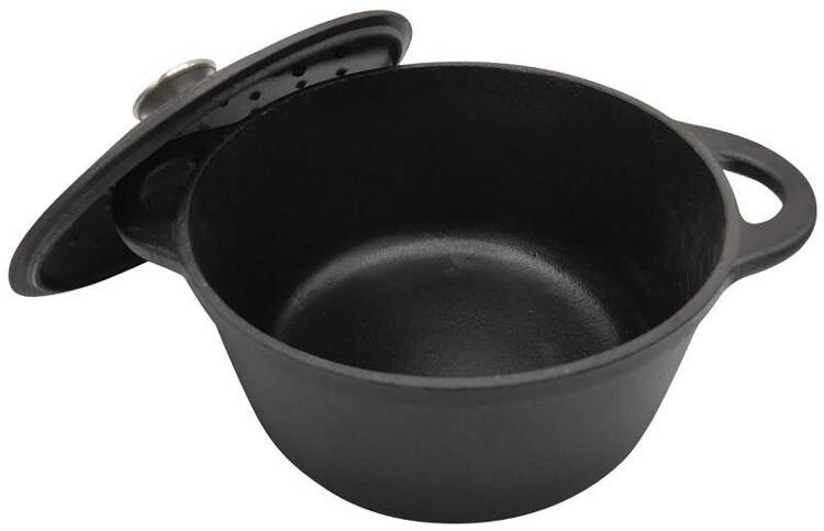 - Okrągły garnek z żeliwa o średnicy 22 cm i pojemności 2.4 litra. Żeliwo nagrzewa się powoli, ale utrzymuje stabilne ciepło przez długi czas, więc jedzenie będzie smakowało wyśmienicie. Odporny na wysokie temperatury, w tym płomień. Można stosować w piek