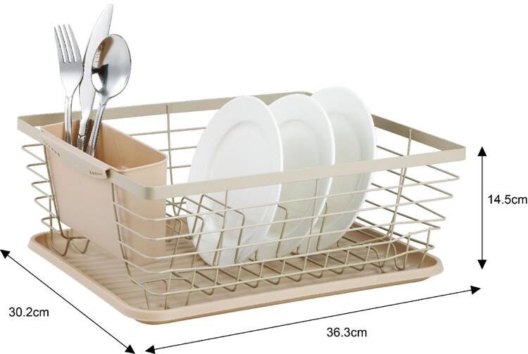 -Wysokiej jakości, powlekana proszkowo metalowa rama-Kolorowa podstawa z drutu z miękką powłoką, chroniąca naczynia-Trwała metalowa konstrukcja-Niewielki ociekacz z rowkami umożliwiający ustawienie maksymalnej liczby talerzy-Tacka na dole zabezpiecza przed zamoczeniem kuchni-Tylko mycie ręczne, osuszyć natychmiast po umyciu-Odłączany plastikowy ociekacz na sztućce