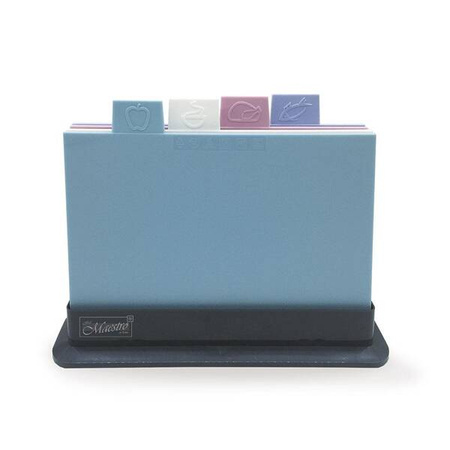 - MR-1787 Zestaw desek na podstawce • komplet 4 dwustronnych desek do krojenia • materiał: tworzywo sztuczne • stojak ułatwiający przechowywanie • wymiary deski: 29 × 19,5 cm /pojedyncza sztuka/ • grubość deski: 0,6 cm /pojedyncza sztuka/ • wymiary kompletu