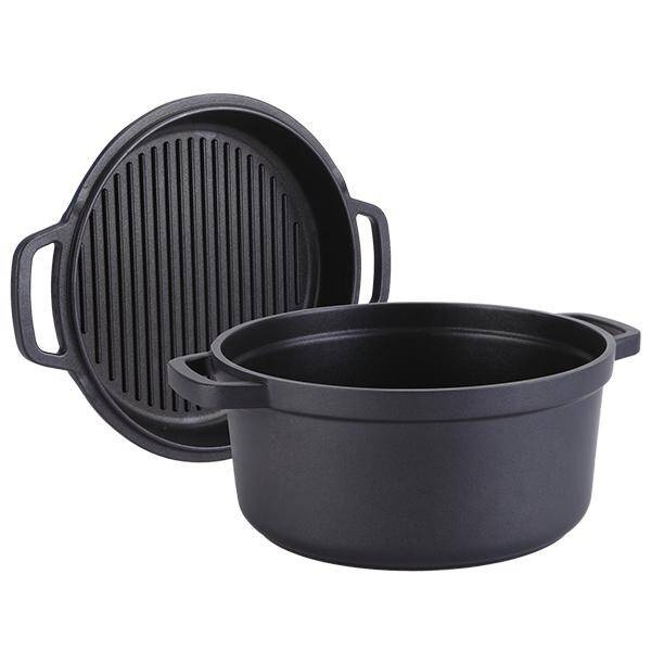 - MR-4124 Garnek z patelnią okrągły 4,5l • średnica: Ø 24 cm • pojemność: 4,5 l • grubość ścianki: 5 mm • wytrzymały odlew aluminiowy • można używać w piekarniku do 260° С • dno garnka + patelni grillowej - do wszystkich typów kuchenek