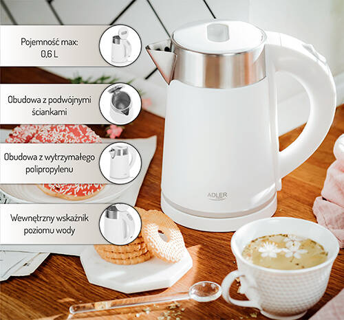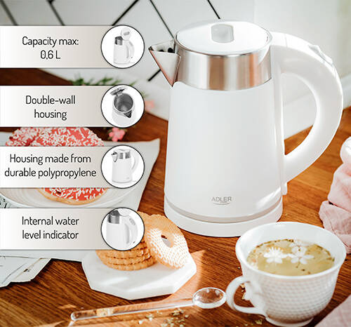 - Wydajny i energooszczędny czajniczek o pojemności 0,6 L, który pozwoli szybko zagotować wodę na kawę lub herbatę dla dwóch osób. Niewielkie rozmiary i pobór mocy sprawiają, że jest on doskonałym wyborem dla osób podróżujących lub ceniących oszczędność. C