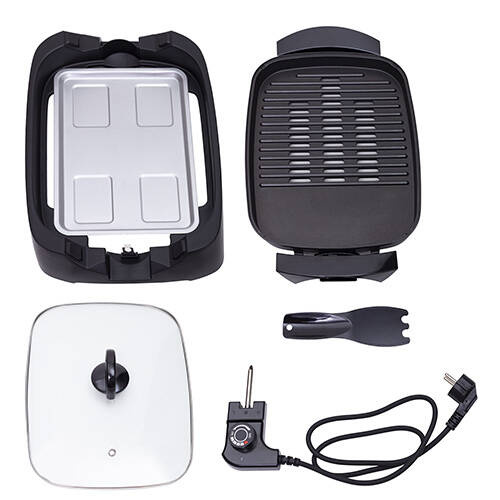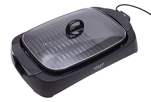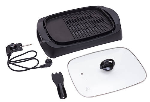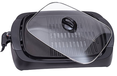 - Wysokiej klasy grill elektryczny o dużej mocy maksymalnej 3000W, na którym łatwo przyrządzić smakowite dania. Dwa pola grzejne - płaskie i karbowane pozwalają przyrządzić zarówno jedzenie smażone jak i grillowane. Dla wygody użytkownika grill ma szklan