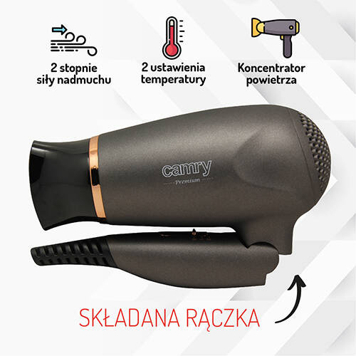- Posiadacze długich lub kręconych włosów z pewnością wiedzą jak ważnym urządzeniem w ich domu jest suszarka do włosów. Polecamy suszarkę CAMRY CR2261, która zadowoli każdego, kto lubi zadbać o fryzurę. Suszarka wyposażona jest w składana rączkę oraz zinteg