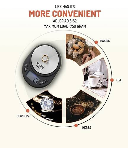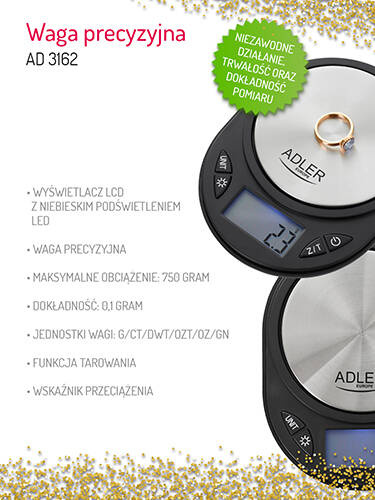 - Niezawodne działanie, trwałość oraz dokładność pomiaru to główne zalety wagi precyzyjnej ADLER AD 3162. Intuicyjna obsługa, niewielkie rozmiary sprawią, że proces ważenia będzie szybki i wygodny. Waga zapewnia dokładne pomiary a wysokiej jakości konstrukc