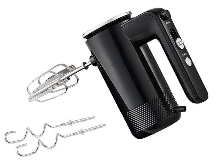 W zestawie znajdują się dwa rodzaje końcówek: trzepaczki do ubijania oraz haki do ciasta, co umożliwia wszechstronne zastosowanie miksera w przygotowywaniu różnych potraw.
