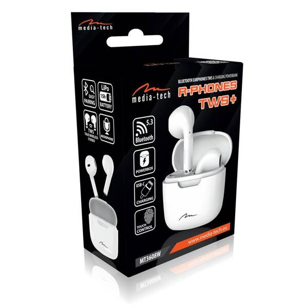 - Bezprzewodowe słuchawki douszne Bluetooth R-PHONES TWS+ MT3608W (białe) Zapraszamy do świata dźwięku bez ograniczeń z bezprzewodowymi słuchawkami dousznymi Media-Tech R-PHONES TWS+ MT3608. Zaprojektowane z myślą o wygodzie, funkcjonalności i niezawodności