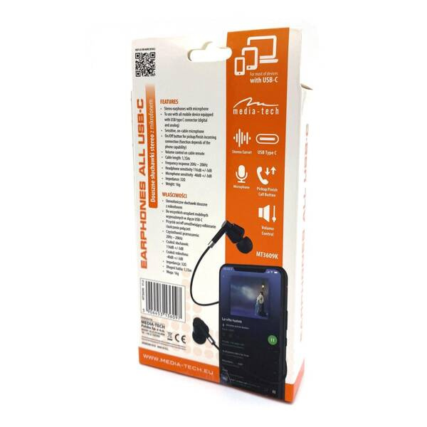 Słuchawki douszne EARPHONES ALL USB-C MT3609K Wygoda i jakość w każdej sytuacji Odkryj nowy wymiar dźwięku z EARPHONES ALL USB-C marki Media-Tech. Te stereofoniczne słuchawki douszne są zaprojektowane, aby dostarczać niezrównaną jakość dźwięku oraz komfort użytkowania niezależnie od sytuacji. Dzięki uniwersalnemu złączu USB-C, EARPHONES ALL USB-C są idealnym towarzyszem dla wszystkich Twoich urządzeń mobilnych, umożliwiając płynne przełączanie między muzyką, podcastami, a połączeniami telefonicznymi. Doskonały dźwięk na wyciągnięcie ręki Z EARPHONES ALL USB-C , każdy dźwięk jest wyraźny i czysty, dzięki szerokiemu zakresowi częstotliwości przenoszenia od 20Hz do 20kHz. Słuchawki te zapewniają bogate basy i krystalicznie czyste wysokie tony, co sprawia, że są one idealne dla miłośników muzyki ceniących każdy szczegół swoich ulubionych utworów. Czułość słuchawek wynosząca 116dB +/-3dB gwarantuje, że każdy dźwięk jest oddany z niezwykłą precyzją. Komunikacja bez przeszkód Zintegrowany mikrofon o czułości -40dB +/-3dB w EARPHONES ALL USB-C sprawia, że każda rozmowa telefoniczna jest krystalicznie czysta, bez względu na otoczenie. Przycisk on/off na pilocie, nie tylko umożliwia łatwe odbieranie i kończenie połączeń, ale również kontrolę nad odtwarzaniem muzyki, co czyni te słuchawki niezwykle funkcjonalnym narzędziem komunikacji w codziennym życiu. Wygodne i praktyczne Lekkość i ergonomia EARPHONES ALL USB-C z wagą zaledwie 16g oraz długością kabla 1,15m zapewniają wygodę użytkowania przez cały dzień. Niezależnie od tego, czy jesteś w ruchu, pracujesz przy biurku, czy relaksujesz się w domu, te słuchawki oferują wygodę noszenia bez obciążenia. Impedancja na poziomie 32ω gwarantuje optymalne dopasowanie do różnorodnych urządzeń, zapewniając jednocześnie długą żywotność baterii Twoich urządzeń mobilnych. Wszechstronne zastosowanie EARPHONES ALL USB-C są idealne dla osób aktywnych, miłośników muzyki, jak i profesjonalistów potrzebujących niezawodnych słuchawek do telekonferencji czy po prostu codziennego słuchania ulubionej muzyki. Niezależnie od tego, czy potrzebujesz słuchawek do biegania, do podróży, czy do pracy z domowego biura, EARPHONES ALL USB-C spełnią Twoje oczekiwania, dostarczając doskonałej jakości dźwięku i wygodę użytkowania na każdym kroku. Dane techniczne: Stereofoniczne słuchawki douszne z mikrofonem Do wszystkich urządzeń mobilnych wyposażonych w złącze USB-C Przycisk on/off umożliwiający odbieranie i kończenie połączeń Częstotliwość przenoszenia: 20Hz – 20kHz Czułość słuchawek: 116dB +/-3dB Czułość mikrofonu: -40dB +/-3dB Impedancja: 32ω Długość kabla: 1,15m Waga: 16g Gwarancja producenta