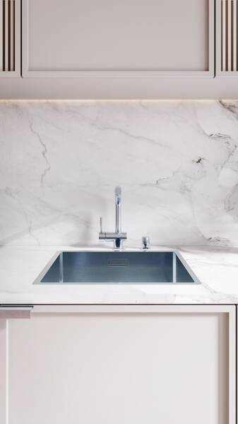 - Wyjątkowe wzornictwo – zlewozmywak Riwolo jest wykończony w kolorze naturalnej stali szczotkowanej, dlatego będzie eleganckim akcentem pasującym do wielu kuchni.