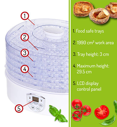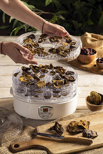 - Praktyczna suszarka do grzybów, ziół i żywności o mocy 550 W. Można w niej suszyć grzyby, warzywa, owoce i zioła, dzięki czemu są one łatwiejsze do przechowywania i nie psują się. Suszarka pracuje cicho i nie przeszkadza w wykonywaniu czynności domowych.