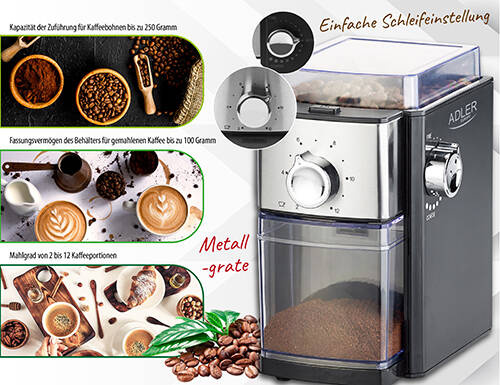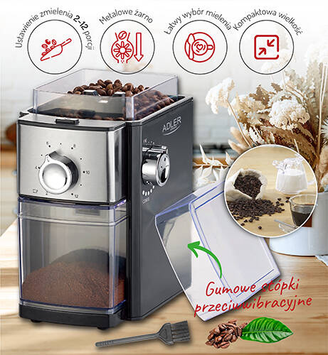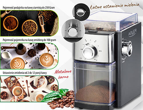 - Żarnowy młynek do kawy o mocy 300 W dla miłośników aromatycznej, świeżo mielonej kawy. Urządzenie cechuje kompaktowy rozmiar i nowoczesny design. Pracuje cicho, z dużą szybkością i jest zabezpieczony przed włączeniem bez założenia pokrywki. Młynek Ad 4448