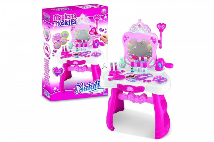 - Magiczna toaletka Natalia- Nowość 2019 Funkcje: Światło Dźwięk Zestawie zawiera: Magiczna różdżka zmieniająca kolor podświetlenia lustra 2 szminki 3 lakiery 2