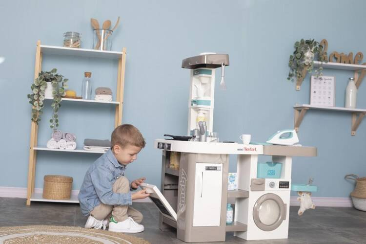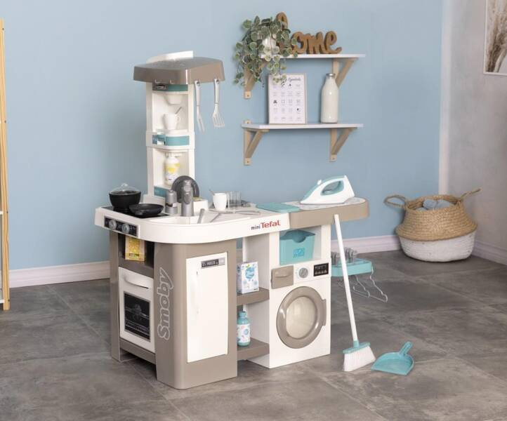 - miniTefal Studio kuchnia z pralnią Kuchnia z dźwiękiem gotowania oraz strefą sprzątania z pralką w 1 produkcie. W zestawie 36 akcesoriów w tym: akcesoria do gotowania takie jak garczek, naczynia, akcesoria do sprzątania takie jak szufelka i