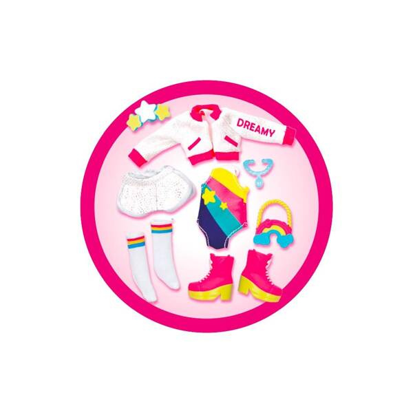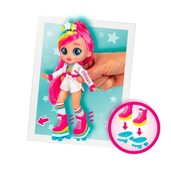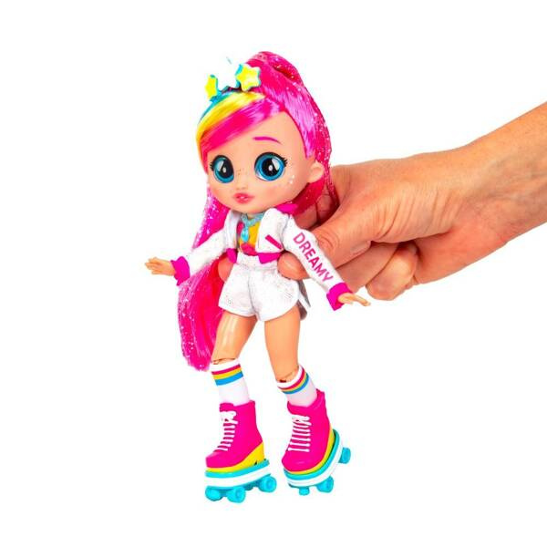 Dzięki laleczce BFF Dreamy i jej jednorożcowi Rymowi zabawa może być jeszcze przyjemniejsza. Róg Rym świeci i wydaje dźwięki, gdy naciśniesz na jego główkę. To magiczna chwila, a przeżywanie jej na nowo to wspaniała zabawa, szczególnie że Rym potrafi wydawać sześć różnych dźwięków. Dreamy i Rym potrafią robić zabawne pozy. Dreamy ma długie, kolorowe, lśniące włosy i szklane oczy, a jej strój przypomina stroje łyżwiarek figurowych. W skład zestawu wchodzą również kółka, dzięki którym Dreamy może udawać, że jeździ na łyżwach, a także siodło, więc Dreamy może jeździć również na grzbiecie Ryma. Przeżywaj wyjątkowe przygody z Dreamy i Rymem!